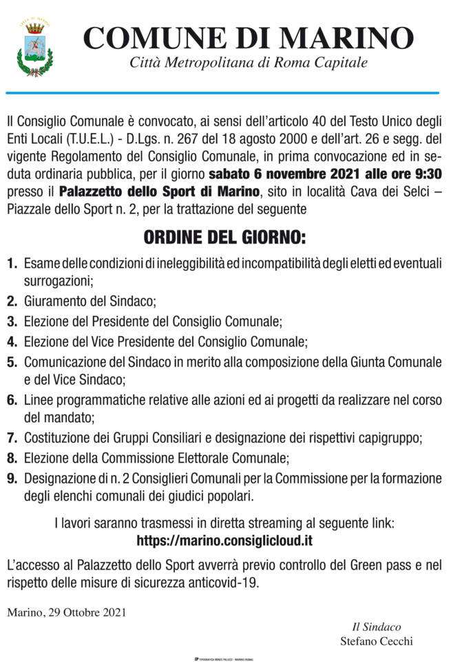 Ecco l’ordine del giorno della seduta inaugurale del Consiglio Comunale di Marino con Stefano Cecchi sindaco della città castellana: