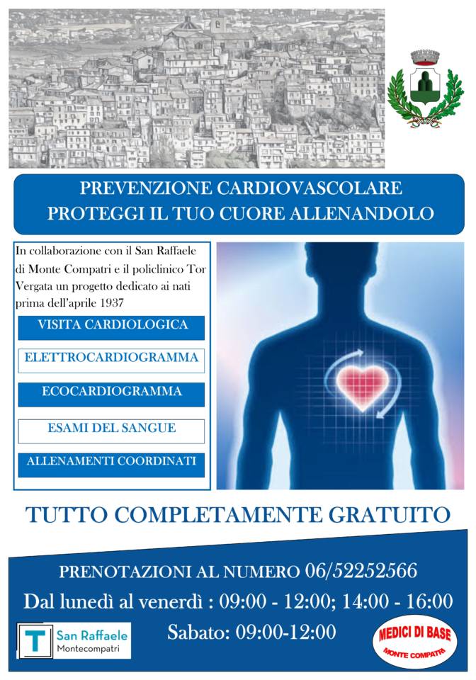 Il San Raffaele di Monte Compatri, in collaborazione con l’amministrazione comunale e con i ricercatori del policlinico Tor Vergata, organizza per i cittadini residenti nati prima dell’aprile 1937: un programma di protezione del sistema cardiovascolare comprensivo di: