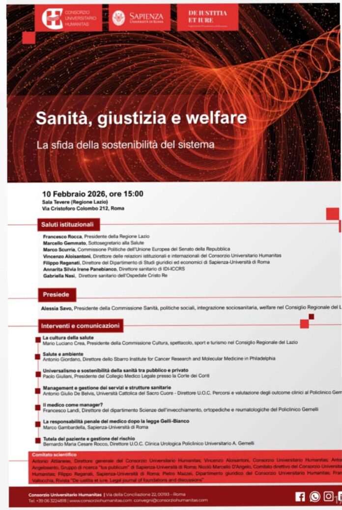 Si terrà martedì 10 febbraio 2026, alle ore 15.00, presso la Sala Tevere della Regione Lazio (via Cristoforo Colombo 212, Roma), il convegno dal titolo “Sanità, giustizia e welfare. La sfida della sostenibilità del sistema”, promosso dal Consorzio Universitario Humanitas in collaborazione con Sapienza Università di Roma – Dipartimento di Studi Giuridici ed Economici.