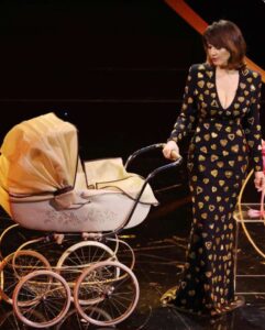 Chiara Francini, protagonista femminile del Festival al fianco di Amadeus e Gianni Morandi, ha voluto citare Oriana Fallaci per sintetizzare il senso della sua presenza a Sanremo 2023. Ironica e brillante, accento spiccatamente toscano, Francini ha dato prova di essere una numero uno. Salita sul palco dell’Ariston senza scendere le celebri scale, almeno all’inizio: “Signor Ama, sono una persona semplice io, vengo dalla provincia di Firenze, da Campi Bisenzio e non me la sento di scendere le scale, semmai… vorrei salirle”. Ha scelto l’irriverenza e il brio di Moschino e con quello Chiara si è distinta fin dalla prima apparizione all’Ariston per simpatia e originalità. Il più scanzonato dei brand per la più spumeggiante delle attrici: il mix è riuscito a meraviglia. Il vestito in velluto blu, con lungo strascico e con un taglio a V sul décolleté, fascia le forme. Il dettaglio da diva è dato dalle voluminose maniche scultura. “Attenzione alle mie ali”, ha scherzato, invitando Gianni Morandi a non scontrarsi con il tessuto dell’abito. Dai capelli, elegantemente raccolti, spuntavano dei fiori rosa, appuntati tra le ciocche. Al collo e alle orecchie spiccavano i preziosi gioielli Crivelli.