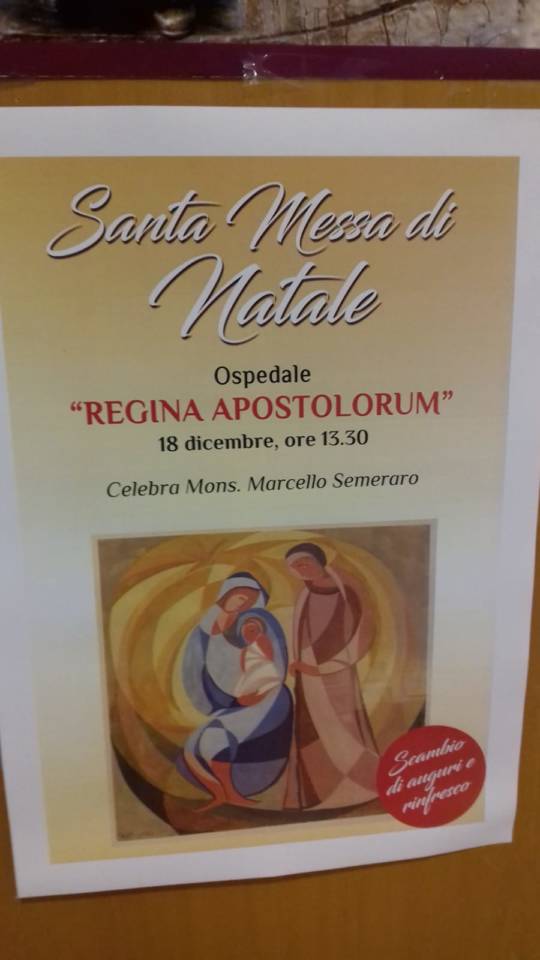 Mercoledì 18 dicembre alle ore 13:30 Monsignor Marcello Semeraro, Vescovo di Albano, celebrerà la Santa Messa di Natale presso l’Ospedale Regina Apostolorum. Sarà un occasione per scambiarsi gli auguri di buone feste e dopo la celebrazione eucaristica sarà offerto un rinfresco a chi interverrà.