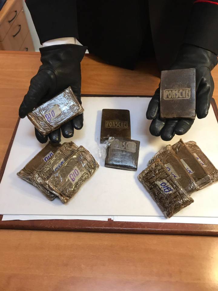 Occultati tra gli scaffali dello sgabuzzino, i Carabinieri hanno rinvenuto e sequestrato le 10 tavolette di hashish incellofanate, marchiate “PORSCHE”, molto richiesto sul mercato, data la qualità di livello superiore dello stupefacente.