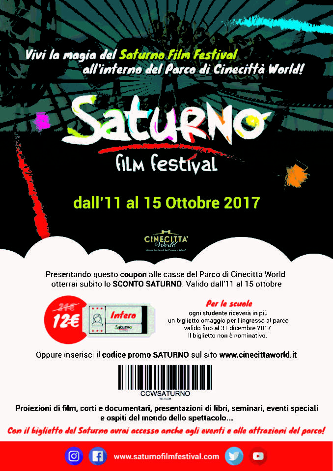 Il biglietto d’ingresso al parco divertimenti, per chi parteciperà agli eventi della 13esima edizione della prestigiosa rassegna del Saturno, tra proiezioni cinematografiche, convegni e seminari, è fissato all’eccezionale prezzo di 12 euro (invece di 24), ottenibile inserendo il codice promo ‘Saturno’ all’interno del sito internet della manifestazione: www.saturnofilmfestival.com (ogni studente che parteciperà con la scuola riceverà un biglietto omaggio non nominativo per l’ingresso al parco, valido fino al 31 dicembre 2017).