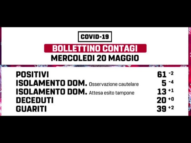 I guariti con i 2 in più rispetto a ieri raggiungono quota 39 a Marino Laziale. Il Primo Cittadino riferisce i dati giornalieri del 20 maggio