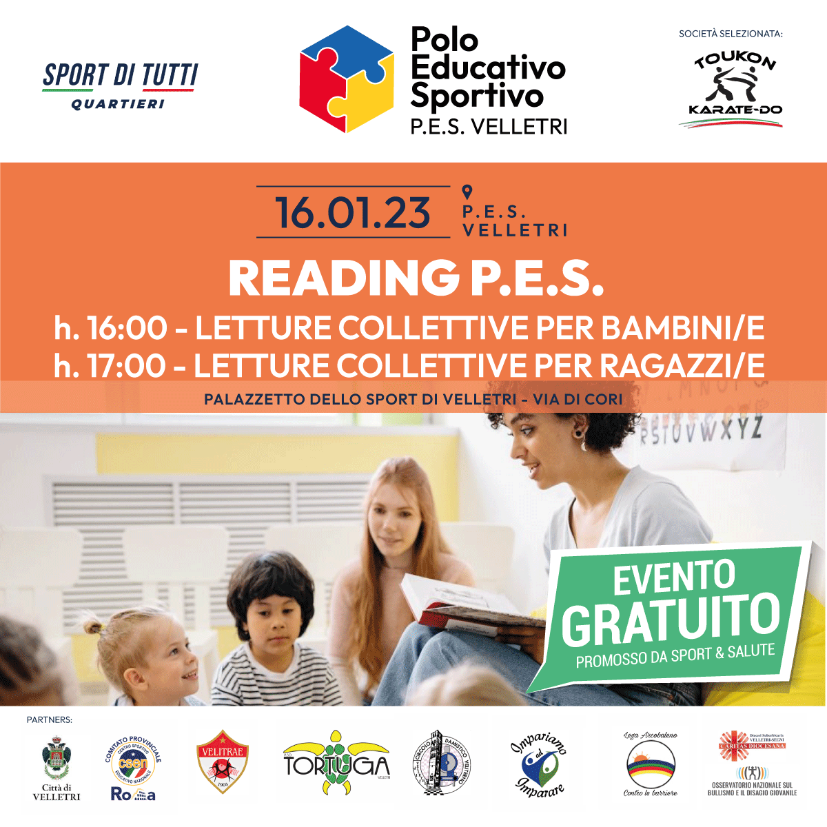 Il Progetto P.E.S. Velletri è promosso da Sport e Salute nell’ambito del Progetto Sport di Tutti Quartieri, vinto dall’Asd Toukon Karate-Do in partenariato con le Associazioni e Organizzazioni partner Asd Ag Velitrae, Asd Circolo Damistico Veliterno Dlf Velletri, Asd Tortuga, Aps Impariamo ad Imparare, Caritas Diocesana Velletri-Segni, Lega Arcobaleno contro le barriere Velletri, Osservatorio Nazionale Bullismo e Disagio giovanile Onlus, Csen Roma, Comune di Velletri.