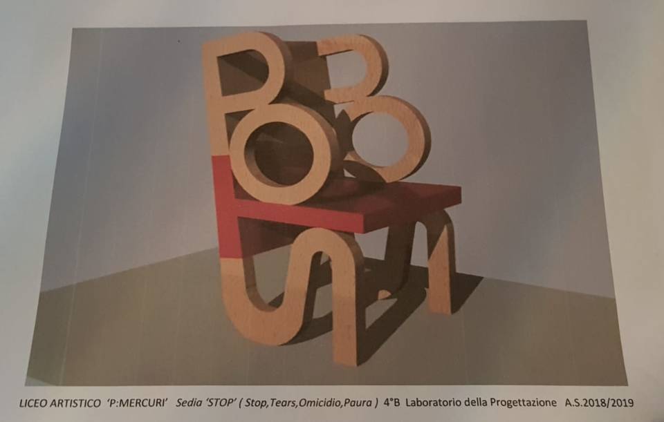 Lo scopo voluto della sedia è quella di rappresentare simbolicamente l’assenza di donne che sono state strappate alla loro vita e che per questo devono essere restituite al loro ruolo nella società civile. L’invito proposto al Dirigente dell’I.I.S. Amari-Mercuri Dott. Montesano è stato quello di coinvolgere nella realizzazione di questa sedia gli allievi e le allieve del Liceo Artistico di Marino, dando spazio alla loro creatività.