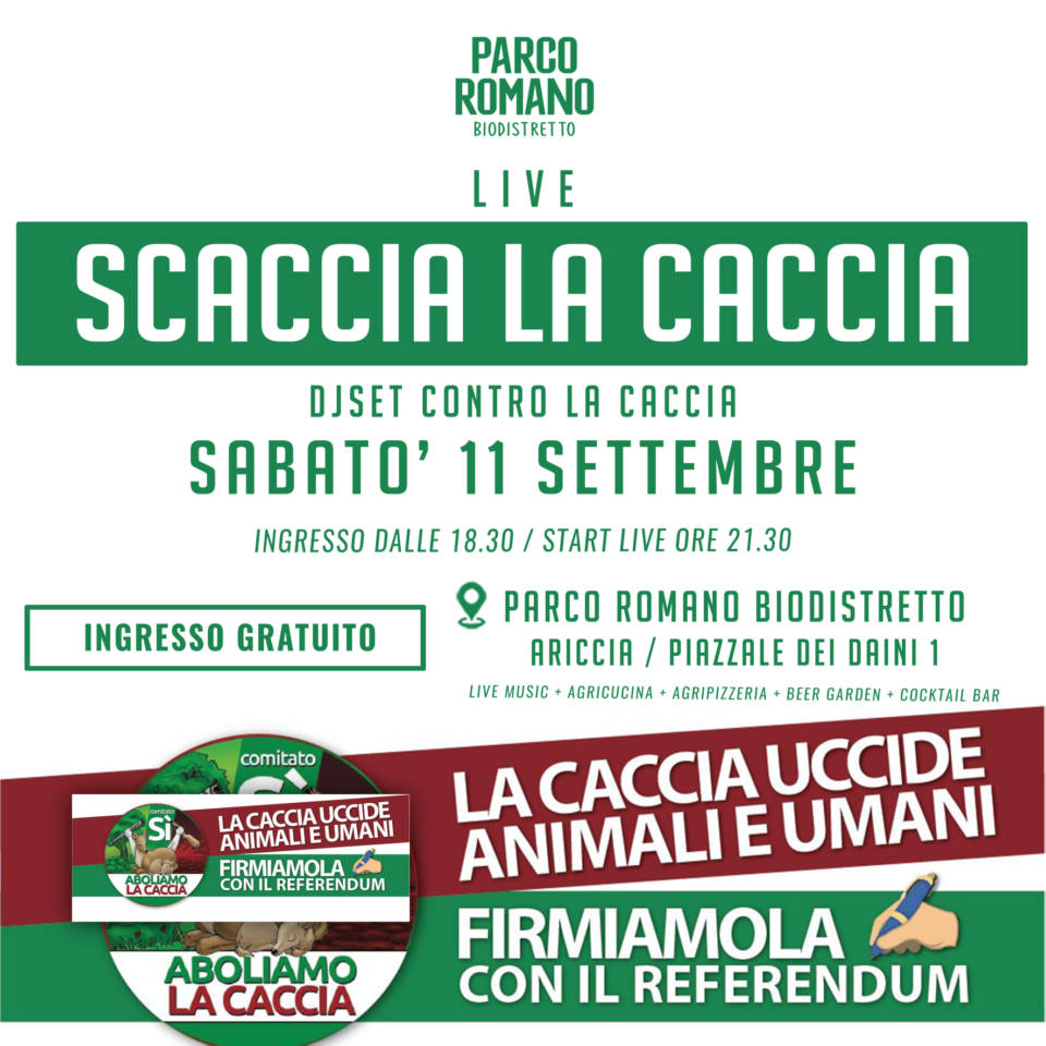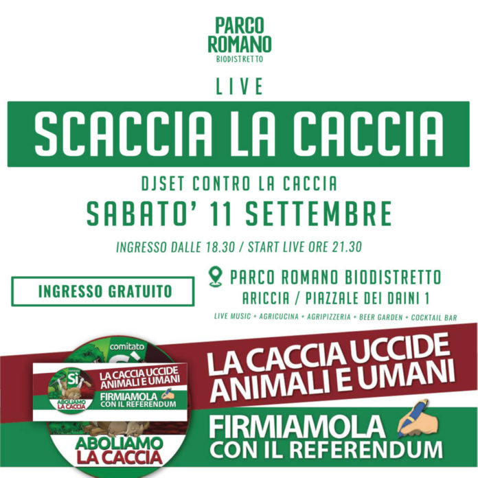 Dalle ore 18 alle 24 siete tutti invitati a Parco Romano Biodistretto per incontrarci, scambiare opinioni e sostenere la nostra adesione alla campagna “Scaccia la caccia” gia’ iniziata in tutti i nostri mercati contadini per la raccolta firme per il referendum contro la caccia.