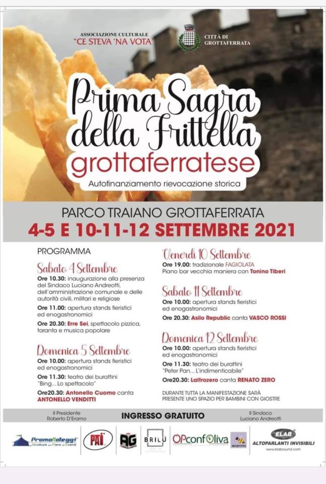 Nel corso del primo fine settimana del Settembre, a cura dell’associazione Ce steva na vota, le porte del Parco Traiano torneranno ad aprirsi alla tradizione grottaferratese con l’attesa Prima Sagra della Frittella che sarà inaugurata sabato 4 settembre alle 10,30 alla presenza del sindaco e delle altre autorità civili, militari e religiose con gli stand che apriranno dalle 11 e resteranno aperti fino alla serata dei domenica 5 settembre con replica e altre attrazioni nel corso del fine settimana successivo, da venerdì 10 a sabato 12 settembre.