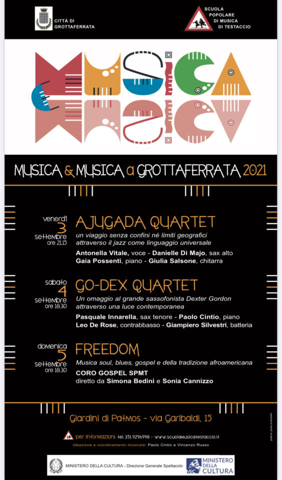 Venerdì 3, sabato 4 e domenica 5 settembre la Scuola Popolare di Musica di Testaccio diventerà ospite “residente” sul palcoscenico dei Giardini di Patmos con una prima serata, alle 21,15 di venerdì, quando sarà di scena l’Ajugada Quartet, gruppo che interpreta il jazz come linguaggio universale e due tardi pomeriggi, sabato e domenica quando, alle 18,30, si esibiranno: il Go-Dex Quartet, omaggio al grande sassofonista Dexter Gordon e il Coro Gospel SPMT, diretto da Simona Bedini e Sonia Cannizzo, che si produrrà nell’evento intitolato Freedom che vedrà l’esecuzione di un programma arricchito da pezzi soul, blues, gospel e della tradizione afroamericana.