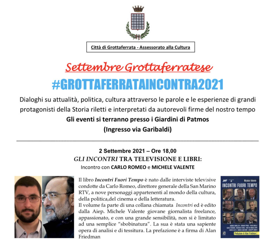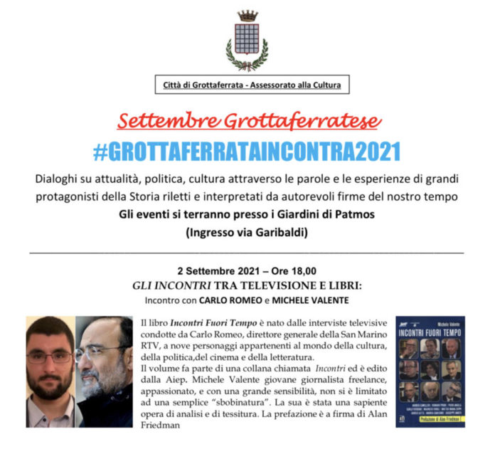 Primi tra gli ospiti di questa edizione saranno il giornalista freelance Michele Valente che assieme a Carlo Romeo, direttore generale della San Marino RTV, ci guiderà alla scoperta degli “Incontri tra televisione e libri”. Altri appuntamenti con GrottaferrataIncontra 2021 saranno, sempre al Parco Patmos, nei giorni di martedì 14, martedì 21 e martedì 28 settembre con tre altri appuntamenti da non perdere.