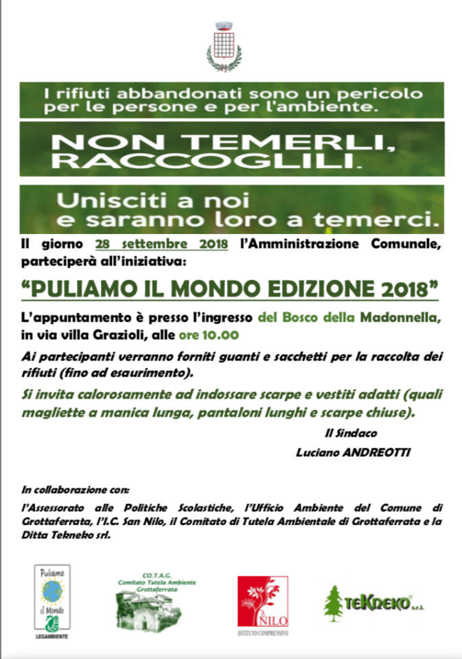 PULIAMO IL MONDO – Si comincia la mattina di venerdì 28 settembre dove l’Amministrazione Comunale, parteciperà all’iniziativa: “Puliamo il mondo – edizione 2018” L’appuntamento è presso l’ingresso del Bosco della Madonnella,