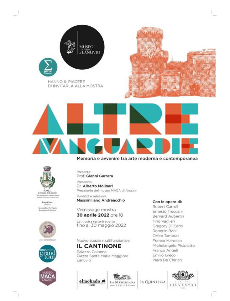 Domani, sabato 30 Aprile alle ore 18:00, si inaugura a Lanuvio, presso il nuovo spazio multifunzionale “Il Cantinone”, la mostra “Altre Avanguardie – Memoria e Avvenire tra Arte Moderna e Contemporanea.”