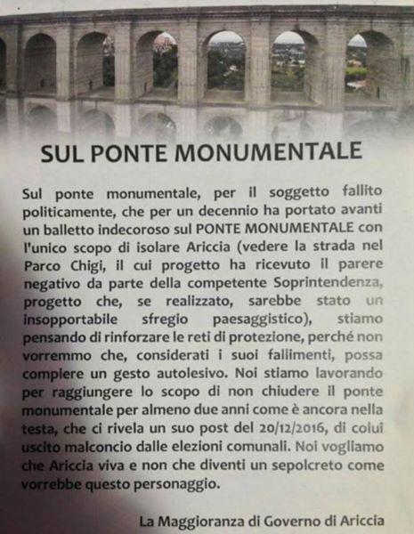 Non appena finite le festività natalizie – che insieme al freddo avevano quantomeno contribuito ad alleviare anche i dissapori e le amarezze delle ultime sedute del Consiglio Comunale di Ariccia – ecco che la maggioranza di governo ariccina ha pensato bene di scrivere e diffondere un volantino dai toni a dir poco raccapriccianti (vedi in basso) – inizia così la nota di Per Ariccia a Sinistra firmata dal consigliere comunale Andrea Sonaglioni. Il sottoscritto e tutti i sostenitori della lista “per Ariccia a Sinistra” intendono esprimere la più profonda indignazione per il linguaggio e le allusioni contenute nel documento, i toni assolutamente squalificanti ed indegni anche della peggiore dialettica politica. Siamo stati i primi a riconoscere l’esito delle ultime elezioni amministrative e a raccoglierne la massiccia e legittima spinta al cambiamento. Ci siamo da subito posti in maniera rispettosa verso tutte le forze politiche che compongono il nuovo Consiglio Comunale, le personalità che formano la Giunta e lo stesso Sindaco. Abbiamo sempre consapevolmente tenuto un comportamento il più possibile aderente a quello che noi stessi, per primi, vorremmo venga sempre osservato, da tutti, pubblico compreso. Lo facciamo perché crediamo nella pari dignità e nell’uguaglianza di tutti a partecipare alle decisioni circa gli indirizzi della nostra amata Ariccia, ognuno dalle rispettive e legittime posizioni. Lo facciamo in un terreno che riteniamo debba essere da tutti condiviso, che preveda regole e codici di comportamento che possano essere i più vicini ad una politica altra ed alta. Lo facciamo perché siamo orgogliosamente e irrimediabilmente di Sinistra. Ci chiediamo a chi giovi questa continua sollecitazione allo scontro, chi tragga vantaggio da questa permanente guerra fra fazioni; di certo sappiamo che non è la nostra comunità ad averne vantaggio – continua così la nota. Non possiamo far altro che invitare i firmatari di quel documento vergognoso a smentire o quantomeno a correggere il tiro rispetto alle parole e ai tragici scenari evocati. A maggior ragione se si tiene conto dell’elevato numero dei fatti di cronaca riguardanti il ponte monumentale che hanno riempito gli articoli di giornali negli ultimi mesi. Dietro quei fatti ci sono famiglie, storie di sofferenze e passioni inquietanti che non possono e non devono mai essere minimamente calpestate da improvvisati umoristi col ghigno patetico dei bulli. Abbiamo letto in una lettera aperta indirizzata dal Sindaco ai cittadini, che egli desidera che “i cittadini di Ariccia recuperino quella concordia necessaria a far crescere la comunità” e che l’Amministrazione che guida “proprio questo desidera con tenacia: concordia”. Bene. Benissimo. E’ il nostro identico sentire e crediamo sia l’intendimento comune di tutta la nostra comunità. Detto questo: è concordia l’allusione paventata nel documento? E’ concordia il linguaggio utilizzato? Noi crediamo che sia quanto di più distante dai suoi apprezzabili intenti, quanto di più lontano dal rispetto e dalla legittima – e più che mai necessaria – dialettica politica. Sindaco, scriva meno e faccia di più – conclude così Sonaglioni. E dica insieme a noi: “NO AL BULLISMO!””.