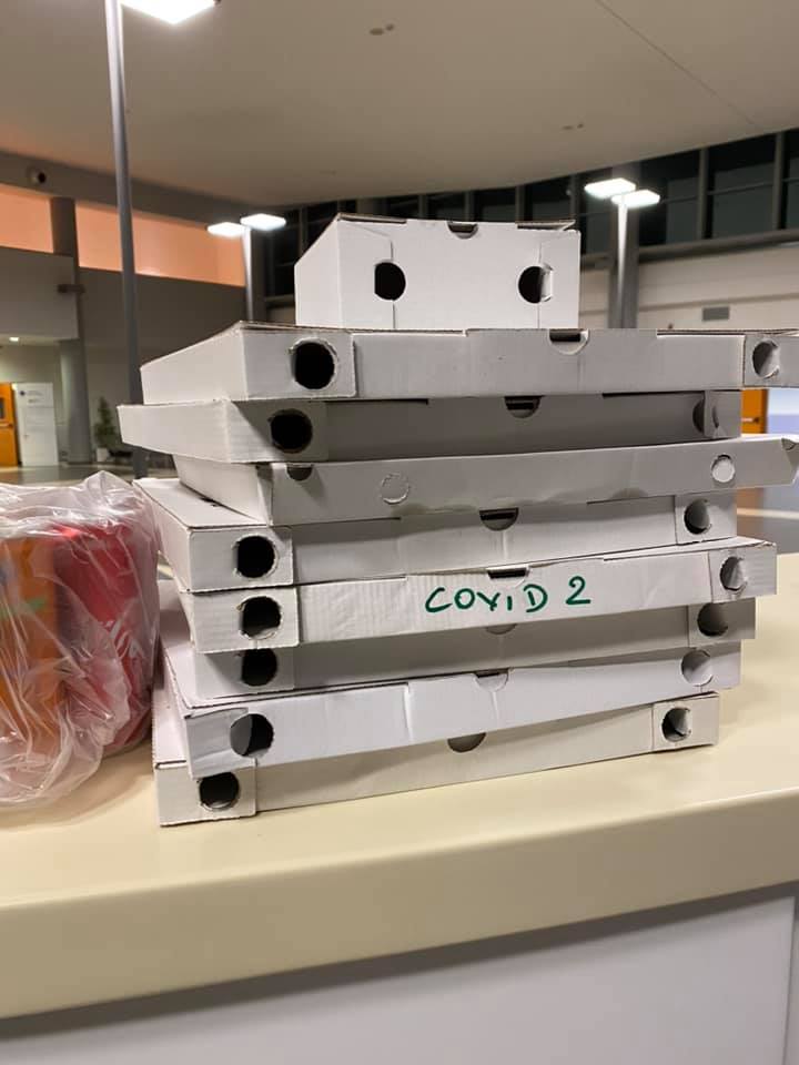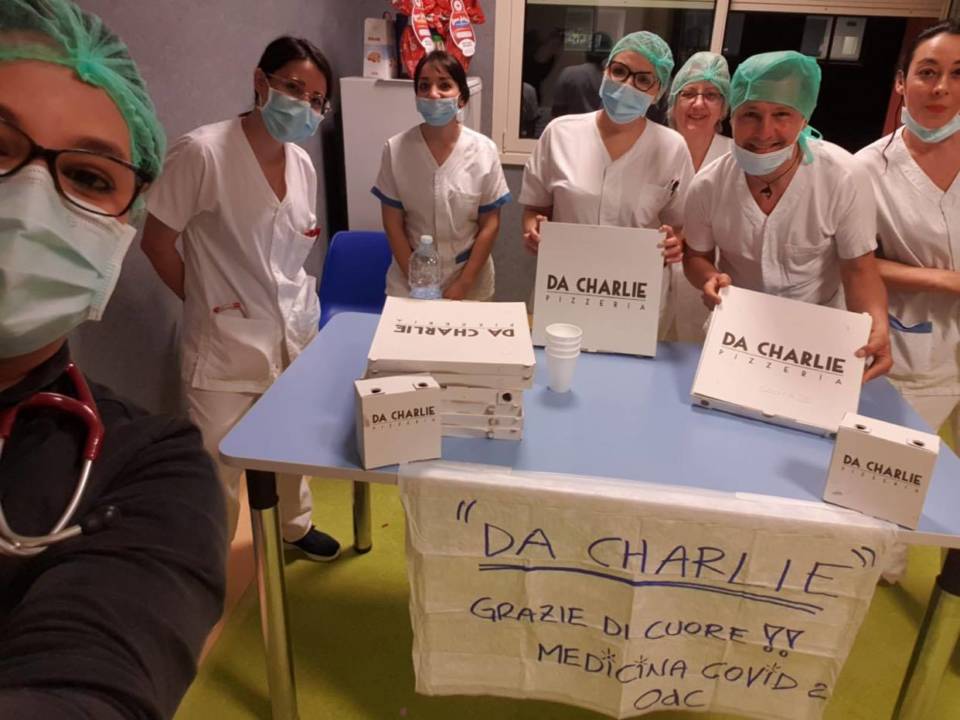 Per onorare loro ed il loro lavoro nasce l’iniziativa di questa sera che ha visto un gruppo di cittadini mobilitarsi per dare un segno tangibile di vicinanza e riconoscimento, ancor più sentito alla vigilia di una Pasqua particolare. Al personale del NOC sono state recapitate direttamente da Charlie Focolari, a nome della sua pizzeria ad Albano, 83 pizze calde con bibite e altrettanti supplì.