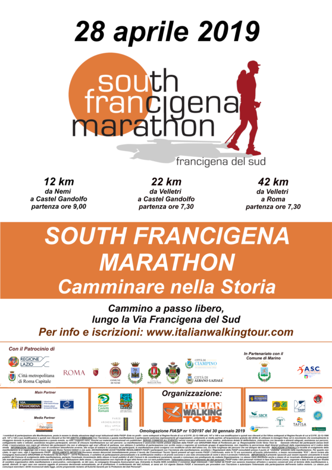 La maratona a passo lento, coinvolge i Comuni di Velletri, Nemi, Rocca di Papa, Albano Laziale, Castel Gandolfo, Marino, Ciampino e Roma, il Parco Regionale dell’Appia Antica, il Parco Archeologico dell’Appia Antica, il Parco Regionale dei Castelli Romani. La manifestazione, omologata e assicurata dalla F.I.A.S.P. (Federazione Italiana Amatori Sport Per Tutti), si avvale della collaborazione dell’Associazione Europea delle Vie Francigene (main partner), Radio Francigena (media partner) e numerosi sponsor. Chiusura iscrizioni il 15 aprile 2019 o al raggiungimento di 3000 iscritti.