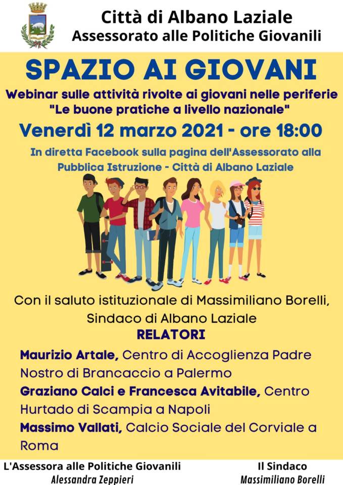 Il Comune di Albano Laziale, attraverso l’Assessorato alle Politiche Giovanili, promuove il webinar “Spazio ai giovani” per conoscere e confrontarsi sulle “buone pratiche” nazionali dedicate ai ragazzi e le ragazze che vivono nelle periferie.
