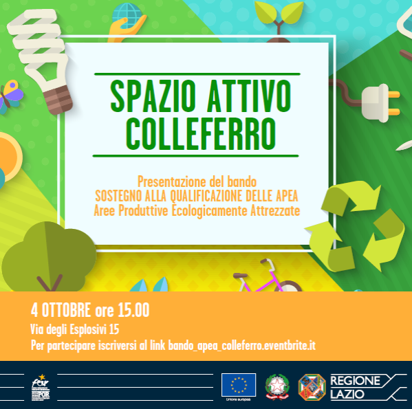 Giovedì 4 ottobre a partire dalle ore 15 sarà presentato il Bando regionale per il sostegno alla creazione delle APEA – Aree produttive ecologicamente attrezzate presso lo Spazio Attivo Lazio Innova di Colleferro.