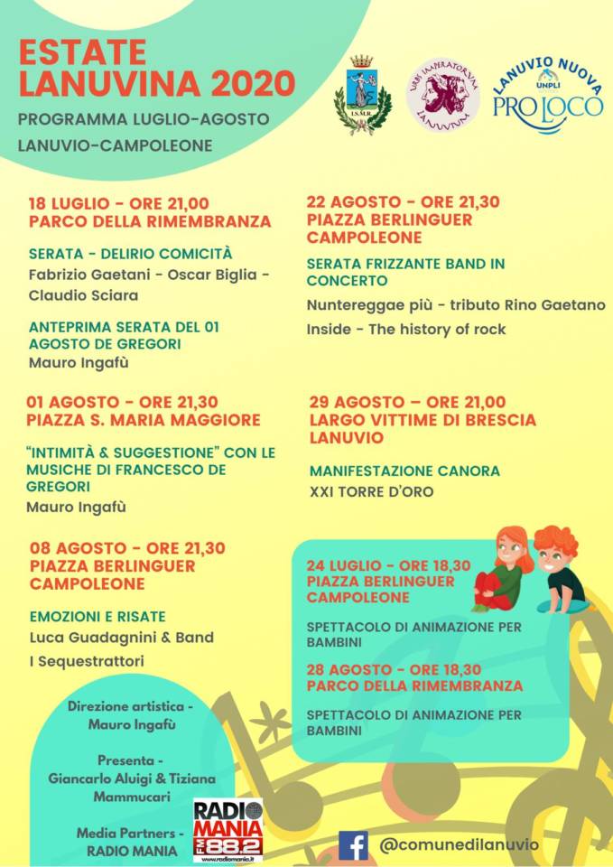 Musica, comicità, spettacoli per adulti e bambini: sono questi gli ingredienti dell’Estate Lanuvina 2020 organizzata dal Comune di Lanuvio e dalla Lanuvio Nuova Pro Loco .La kermesse, con la direzione artistica affidata a Mauro Ingafù, prenderà il via il 18 luglio e si concluderà il 28 agosto. Esprimono soddisfazione l’Assessore alla Cultura Alessandro De Santis e  l’Assessore al Turismo Valeria Viglietti : “Nonostante l’emergenza Covid ancora in corso, siamo lieti di poter offrire alla Cittadinanza e ai turisti, una serie di appuntamenti estivi di livello in piena sicurezza”. In allegato il cartellone completo delle iniziative”. Ne da notizia il Comune di Lanuvio.