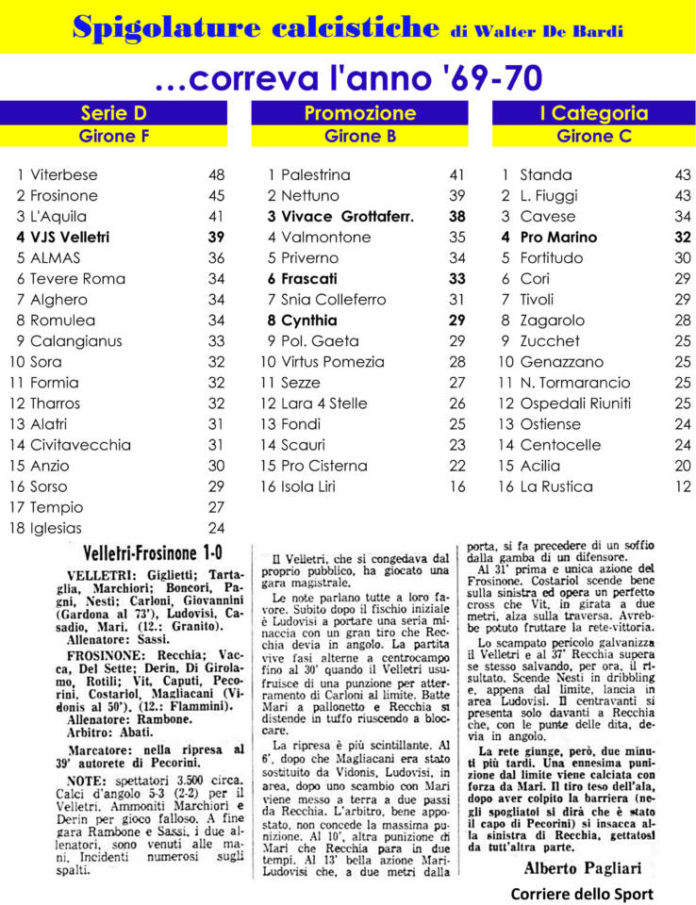 La cronaca di Velletri-Frosinone sul Corriere dello Sport a firma di Alberto Pagliari con la vittoria della squadra castellana di stretta misura