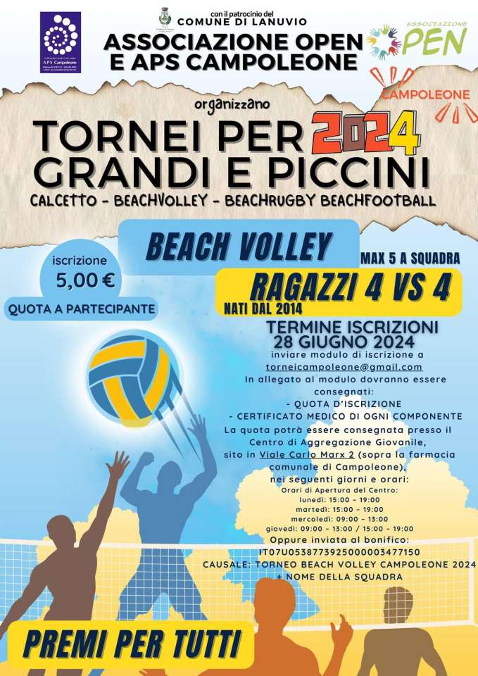 L’Associazione Open e l’APS Campoleone, con il patrocinio del Comune di Lanuvio, organizzano tornei di calcetto, beachvolley,beachrugby e beachfootball per adulti e ragazzi( dai 10 fino ai 15 anni di età) che si svolgeranno, dal 30 giugno al 5 luglio presso il campo attrezzato adiacente al Polivalente di Campoleone. Esprime soddisfazione il vicesindaco, delegato allo sport di Lanuvio Valeria Viglietti: “Ringrazio le associazioni per aver voluto organizzare questa splendida iniziativa che consentirà a grandi e piccini, di praticare attività sportive sulla sabbia, un modo divertente per socializzare e ottenere un benessere psicofisico”.