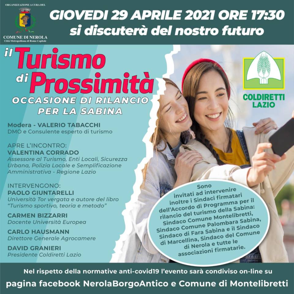 Giovedì 29 Aprile 2021, una data importante per gli addetti del settore del Turismo, per gli operatori e per tutti gli appassionati: “si discuterà del nostro futuro”! Aprirà i lavori del “web seminar” l’Assessore al Turismo alla Regione Lazio Valentina Corrado, interverrà Paolo Giuntarelli (Dirigente dell’Area Predisposizione degli Interventi della Direzione Regionale, Istruzione, Formazione, Ricerca e Lavoro” della Regione Lazio) autore del libro “Turismo Sportivo, Teoria e Metodo”.