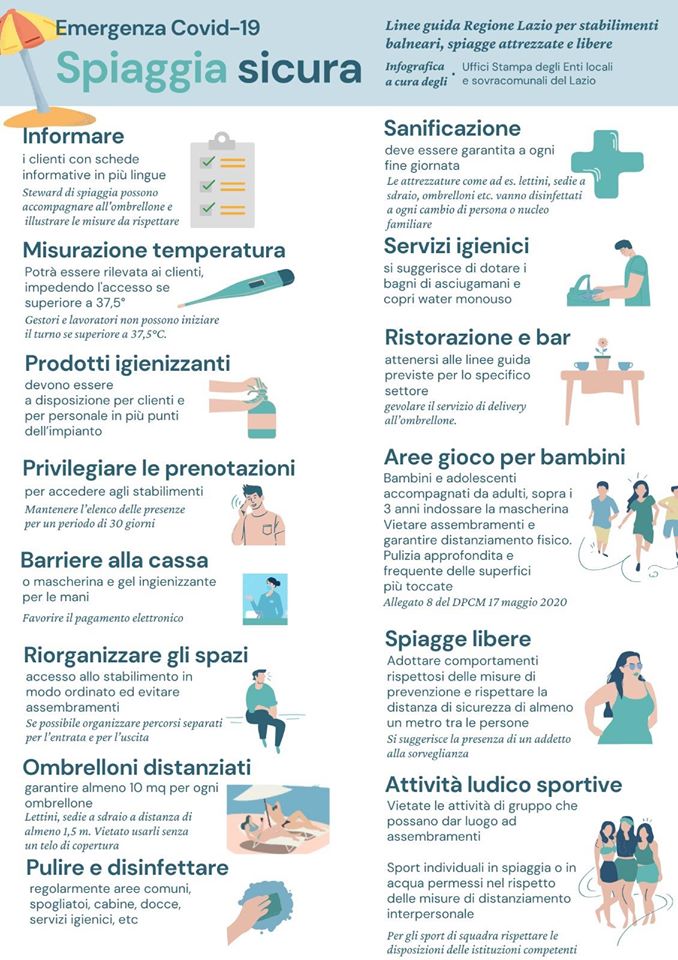 Diverse le misure anti Covid da seguire per gli stabilimenti balneari e le spiagge attrezzate, secondo le disposizioni nazionali e le linee guida regionali: informazioni in più lingue sulle misure di prevenzione, steward di spiaggia, prodotti igienizzanti, prenotazioni, misurazione della temperatura consigliata, organizzazione dell’accesso e dell’uscita nel rispetto del distanziamento sociale, obbligatoria una superficie di almeno 10 mq per ogni ombrellone e una distanza di 1,5 m tra lettini e sdraio, pulizia e disinfezione delle aree comuni, sanificazione delle attrezzature, servizio delivery in spiaggia, vietata l’attività ludico-sportiva di gruppo. Per quanto riguarda le spiagge libere, il Comune di Pomezia si avvarrà, già a partire da domani, del supporto e della sorveglianza di personale dedicato, gestito dalla società partecipata “Servizi in Comune”. Gli addetti informeranno cittadini e turisti sulle misure da rispettare, e installeranno sulle spiagge paletti in corrispondenza del corretto posizionamento degli ombrelloni. “Stiamo lavorando anche per estendere la App utilizzata dal Comune di Roma all’intero litorale sud – spiega il Sindaco Adriano Zuccalà – L’applicazione segnala l’affollamento delle spiagge con i colori del semaforo, in modo da scoraggiare affluenze eccessive. Sarà un’estate complessa, ma sono certo che, con la collaborazione dei balneari e della cittadinanza, riusciremo tutti a goderci l’estate”. Inoltre, come ogni anno, da metà giugno fino a metà settembre, saranno installate in tutto il litorale di Torvaianica 8 postazioni di salvataggio con torretta, passerella e sedia job per disabili: