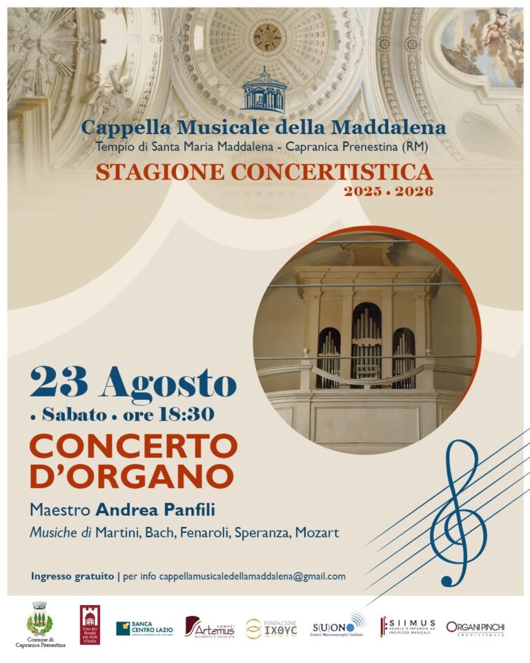 La Stagione Concertistica di Capranica Prenestina si arricchisce di un nuovo tassello. Sabato 23 Agosto alle ore 18.30 presso la Cappella Musicale del Tempio della Maddalena a Capranica Prenestina avrà luogo un Concerto D’Organo sapientemente guidato dal talentuoso organista Andrea Panfili. Romano di nascita Panfili si diploma in Pianoforte presso il Conservatorio Alfredo Casella (l’Aquila), inizia una luminosa carriera, inizialmente in qualità di pianista con i Concerti al Circolo degli Ufficiali delle Forze Armate , all’Università la Sapienza ai giardini di Castel S’Angelo, nella cripta di S.Lucia del Gonfalone sino all’Accademia Acisam di Napoli. Presto si appassiona agli Organi Antichi ,dilettandosi nello studio di un repertorio confacente a questo strumento. Scrive numerosi saggi in materia. Il programma vedrà in apertura l’esecuzione di due brani di Giovanni Battista Martini il Deo gratias e la suonata di Flauti a seguire Il Divertimento per cembalo che rappresenta il Pianto e il Riso del compositore irpino Alessandro Speranza. Sarà poi la volta del Concerto in stile Italiano BWV 971 di Johann Sebastian Bach. Il programma si concluderà con tre brani di Mozart, L’Adagio per armonica a bicchieri KV356 composto a Vienna nel 1971 per Marianne Kirchgassner, L’Andante per organo meccanico KV 356 composto sempre a Vienna nel 1791. infine verrà eseguita la festosa Marcia KV 408 per archi e oboi, corni, trombe e timpani composta a Vienna nel 1782. l’Evento sarà come sempre ad ingresso libero in linea con tutte le iniziative di Don Davide Martinelli, divenuto ormai un punto di riferimento imprescindibile per l’intera comunità di Capranica Prenestina.
