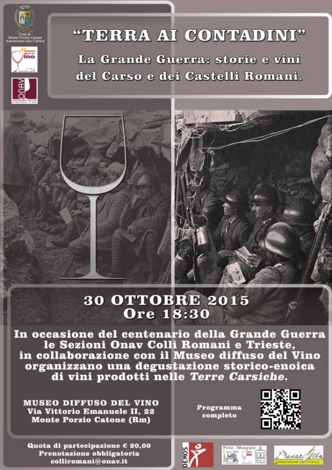 Il 30 ottobre 2015 dalle ore 18:30 alle ore 21:30 presso il Museo diffuso del Vino di Via Vittorio Emanuele II, 22 a Monte Porzio Catone (Rm) l’evento “TERRA AI CONTADINI!” La Grande Guerra: storie e vini del Carso e dei Castelli Romani.