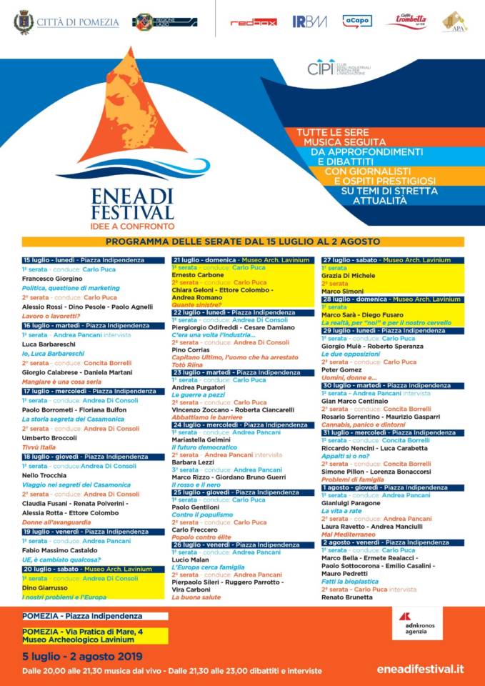 “Eneadi Festival è una rassegna di cultura e attualità partita il 15 luglio, in scena qui a Pomezia fino ai primi di agosto. Le serate sono incentrate su diverse tematiche, spaziando dall’arte al sociale, con interviste a giornalisti, politici, artisti, uomini di cultura, importanti imprenditori e sportivi. Potremmo definire questa iniziativa come il giusto mix di cultura e attualità, che mira ad esaltare le bellezze di Pomezia: dal museo Lavinium, punta di diamante del nostro patrimonio storico-archeologico e culturale, nonché raffinata location scelta per l’iniziativa, a piazza Indipendenza, cuore pulsante dell’attività cittadina che farà da cornice alla kermesse nelle serate di maggiore affluenza”;