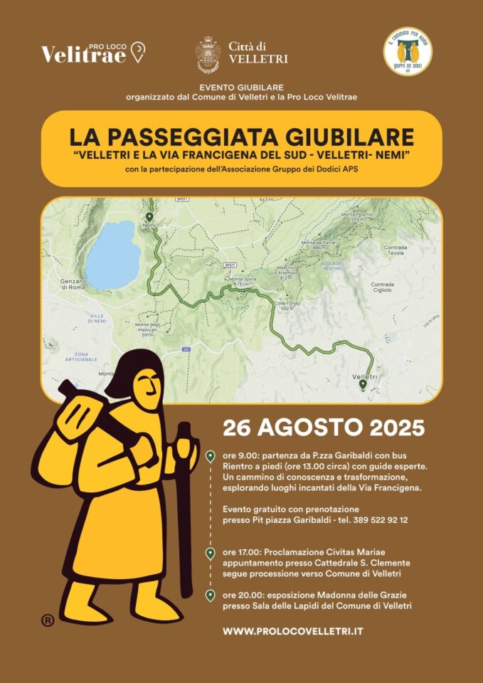 In occasione della storica giornata in cui Velletri sarà proclamata “Civitas Mariae”, l’Amministrazione Comunale, in collaborazione con la Pro Loco Velitrae, invita la cittadinanza, i pellegrini e gli amanti del cammino a partecipare a un’esperienza unica di condivisione e scoperta del territorio.