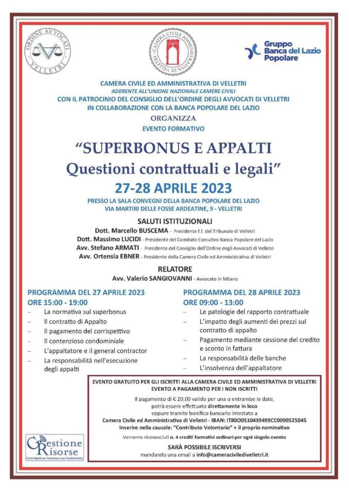 La Camera Civile ed Amministrativa del Tribunale di Velletri, presieduta dall’avvocato Ortensia Ebner, organizza in collaborazione con la Banca Popolare del Lazio l’evento formativo “SUPERBONUS E APPALTI – Questioni contrattuali e legali”. L’iniziativa, patrocinata dal Consiglio dell’Ordine degli Avvocati di Velletri, si terrà nelle giornate di giovedì 27 e venerdì 28 aprile presso la sala convegni della Banca Popolare del Lazio in via Martiri delle Fosse Ardeatine n. 9 a Velletri. L’evento formativo vedrà riconosciuti n. 4 crediti formativi ordinari per ogni singolo evento.