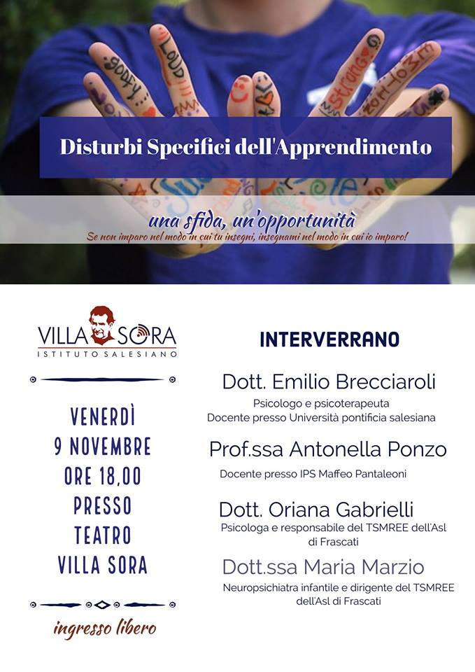 Tavola rotonda DSA (Disturbi Specifici dell’Apprendimento) venerdì 9 novembre 2018, ore 18:00 a Frascati presso il teatro di Villa Sora.