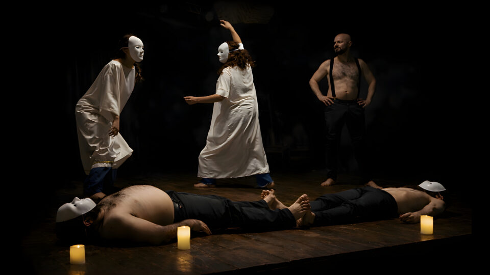 I corpi in movimento attraversano lo spettacolo con sequenze coreografiche intense, in cui gesto, postura e mimica raccontano ciò che il testo tace. Gli attori recitano a piedi nudi: le donne indossano jeans aderenti e corpetti neri, gli uomini sono a torso nudo con pantaloni neri. Una scelta che esalta la fisicità, mettendo in dialogo femminilità e virilità in una dimensione primordiale.