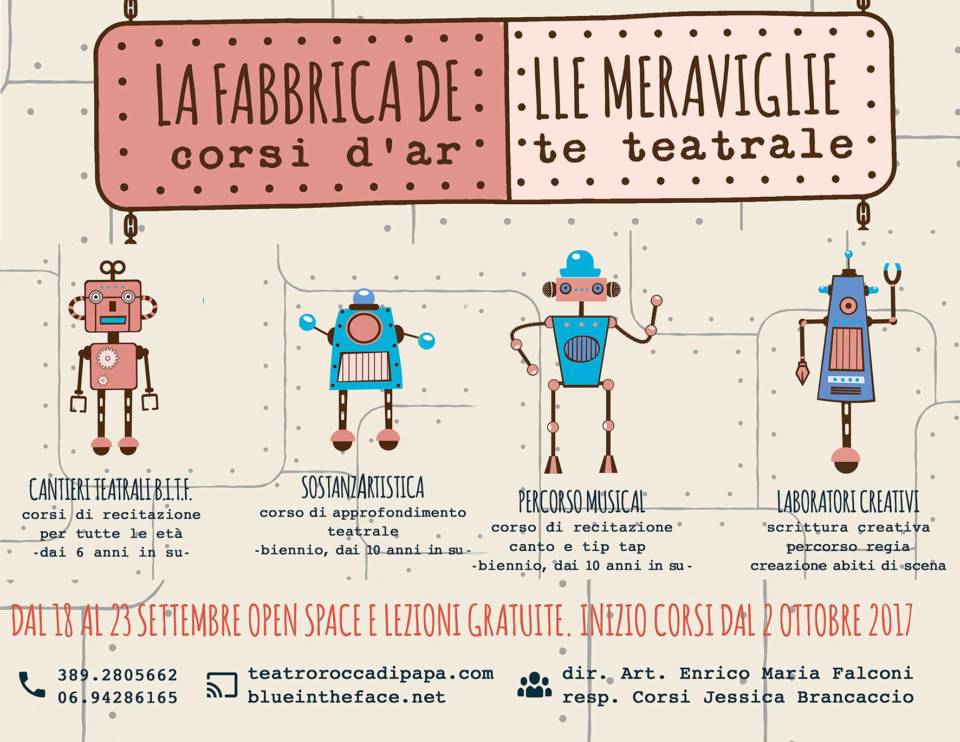 Si terrà il 17 settembre dalle ore 18:00 la presentazione delle attività per la stagione 2017/2018 del Teatro Civico di Rocca di Papa. La serata, aperta al pubblico, racconterà la nuova stagione teatrale, firmata da Enrico Maria Falconi ed organizzata dalla associazione culturale “Blue In The Face”, verranno presentati gli spettacoli di cui è composto il Cartellone Artistico, compresa la stagione riservata al Teatro dei Ragazzi, che negli ultimi anni ha riscosso un buon successo. Inoltre, verranno presentati i corsi della scuola di teatro, aperti a tutte le età e con l’aggiunta di nuove discipline artistiche.
