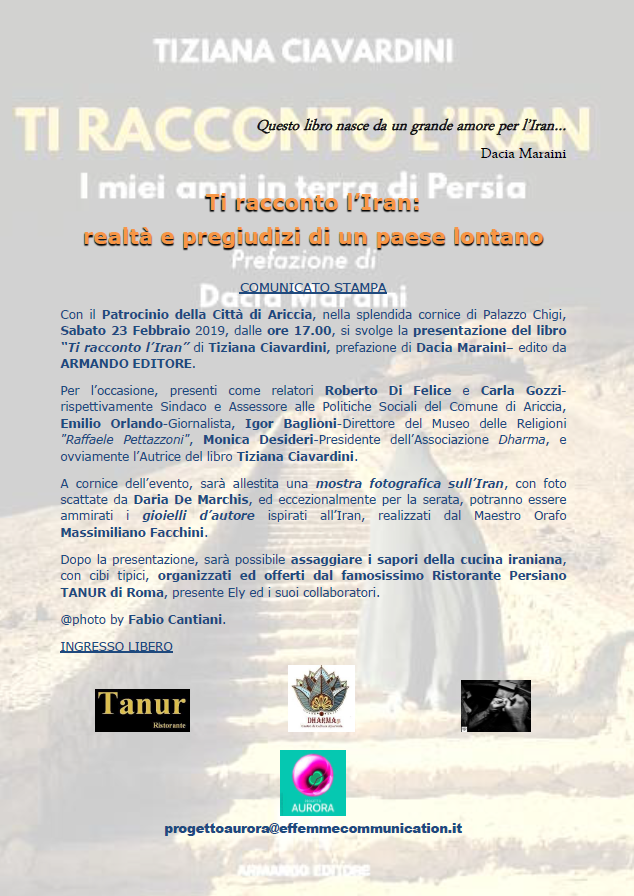 Con il Patrocinio della Città di Ariccia, nella splendida cornice di Palazzo Chigi, Sabato 23 Febbraio 2019, dalle ore 17.00, si svolge la presentazione del libro “Ti racconto l’Iran” di Tiziana Ciavardini, prefazione di Dacia Maraini– edito da ARMANDO EDITORE. Per l’occasione, presenti come relatori Roberto Di Felice e Carla Gozzi – rispettivamente Sindaco e Assessore alle Politiche Sociali del Comune di Ariccia, Emilio Orlando – Giornalista, Igor Baglioni – Direttore del Museo delle Religioni “Raffaele Pettazzoni”, Monica Desideri -Presidente dell’Associazione Dharma, e ovviamente l’Autrice del libro Tiziana Ciavardini.