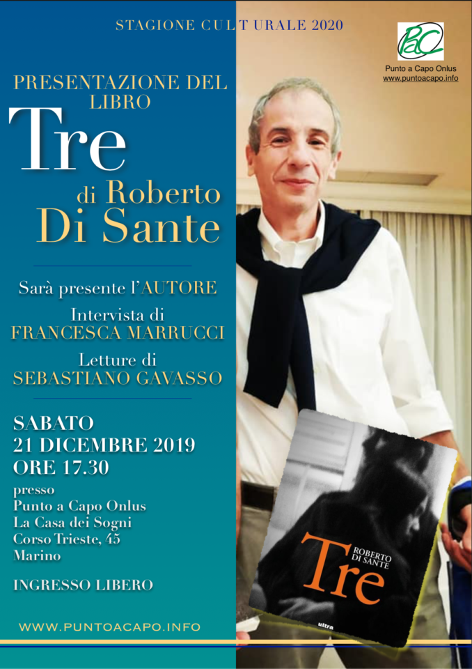 È stato rimandato a sabato 28 dicembre 2019 alle 17,30 per condizioni atmosferiche avverse, presso la sede operativa di Punto a Capo Onlus, La Casa dei Sogni, Corso Trieste, 45 a Marino, suo paese natio, Roberto Di Sante per presentare il suo nuovo romanzo ‘Tre’, dopo il successo di ‘Corri’. Insieme all’Autore ci saranno l’attore Sebastiano Gavasso – in questi giorni sulla Rai nel docu-dramma ‘Giorgio Ambrosoli – Il prezzo del coraggio’ – che porterà la versione teatrale di ‘Corri’ in tournée nei teatri italiani e che domani leggerà alcuni brani del nuovo romanzo di Di Sante, e Francesca Marrucci, Direttore Editoriale delle testate Punto a Capo e Presidente della Onlus, che intervisterà Roberto e Sebastiano. In questo anno e mezzo dall’uscita di ‘Corri’ per Roberto Di Sante ne sono successe di cose bellissime ed inaspettate. I riconoscimenti della critica, l’affetto dei lettori, i premi, le presentazioni internazionali e su e giù per la Penisola, oltre alla trasposizione del romanzo in sceneggiatura e spettacolo teatrale, sembrano avviati a ripetersi amplificati per il secondo romanzo ‘Tre’, di genere completamente diverso da ‘Corri’. Presentato qualche giorno fa a Più Libri più Liberi a Roma, ‘Tre’ è stato definito con toni entusiastici dalla stampa: “Una storia d’amore ben congegnata e piena di suspence”, Fabio Isman de Il Messaggero; “Un filo magico che cuce le pagine, storie ed emozioni” per Marco Patucchi de La Repubblica; “Un romanzo che regala emozioni dalla prima all’ultima riga” per Marco Lobasso di Leggo. L’ingresso è libero.