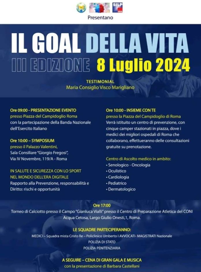 Lunedì 8 luglio torna a Roma la terza edizione de “Il Goal della Vita”. L’iniziativa, promossa dall’Associazione Mida Academy e dall’Associazione IURIS Vittime del Dovere della Polizia di Stato, in collaborazione con il Policlinico Umberto I e l’Università di Roma La Sapienza e patrocinata dall’IDI IRCSS Istituto Dermopatico dell’Immacolata, con il patrocinio della Città Metropolitana di Roma Capitale, del Coni e dell’Ordine degli Avvocati di Roma. L’iniziativa ha quest’anno come slogan “In salute e sicurezza con lo sport nel mondo dell’era digitale”. Anche per questa edizione ci sarà, in qualità di madrina, Maria Consiglio Visco Marigliano.