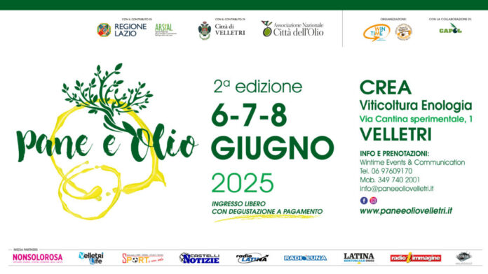 Dopo il successo della prima edizione, torna a Velletri “Pane e Olio”, l’evento imperdibile per tutti gli appassionati di olio extravergine di oliva. Ideato e realizzato dall’Agenzia WinTime Events & Communication e il Consorzio Tutela e Promozione Associazione Pane di Velletri in collaborazione con l’Associazione CAPOL (Centro Assaggiatori Produzioni Olivicole Latina), l’evento gode del contributo del Comune di Velletri e della Regione Lazio e ARSIAL e del patrocinio dell’Associazione Nazionale Città dell’Olio.