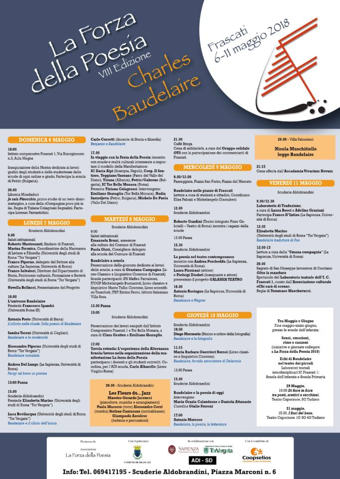 Dopo il grande successo delle passate edizioni, Frascati ospita l’ottava edizione de “La forza della Poesia”, che quest’anno avrà per protagonista uno dei più grandi poeti della contemporaneità: Charles Baudelaire. L’iniziativa è promossa dall’Associazione La Forza della Poesia con il Patrocinio del Comune di Frascati, il Contributo di Coopselios e in collaborazione con La Sapienza Università di Roma, Università degli Studi di Tor Vergata e ADI-SD. Ideata e curata da Novella Bellucci (Università “La Sapienza”) la manifestazione presenta sei giornate di studio, approfondimento, letture, musica e spettacoli, dedicate alle parole e ai versi di Baudelaire (dal 6 al 11 maggio 2018), che coinvolgeranno l’intera comunità cittadina, i docenti universitari, i professori, gli studenti, le famiglie, grazie a un programma ampio e articolato, i cui protagonisti interverranno tutti a titolo gratuito.