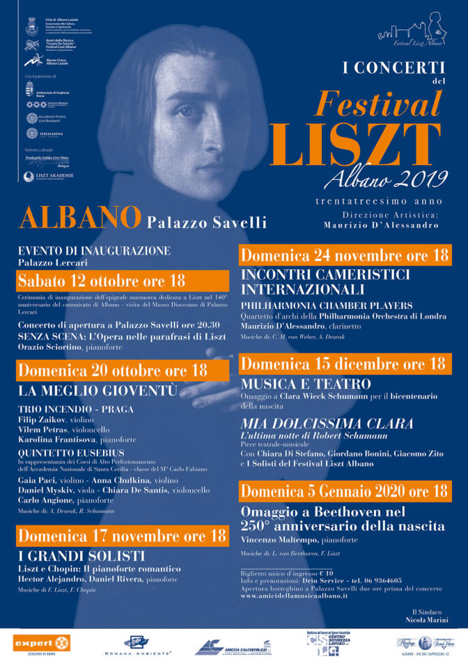 Parte il Festival Liszt Albano 2019. La manifestazione, giunta al suo trentatreesimo anno, sotto la direzione artistica del Maestro Maurizio D’Alessandro, a cura dell’Assessorato alla Cultura e dell’Associazione “Amici della Musica – Cesare De Sanctis”. L’edizione 2019 si terrà sabato 12 ottobre alle ore 18 a Palazzo Lercari con la cerimonia di inaugurazione dell’epigrafe marmorea dedicata a Liszt nel 140° anniversario del canonicato di Albano. Il concerto di apertura si terrà, invece, a Palazzo Savelli alle ore 20.30 con il Maestro Orazio Sciortino. Anche gli altri concerti si terranno in Sala Nobile. Domenica 20 ottobre alle ore 18 “La meglio gioventù” con il Trio Incendio – Praga, formato da Filip Zaikov (violino), Vilem Petras (violoncello), Karolina Frantisova, e il Quintetto Eusebius con Gaia Paci (violino), Anna Chulkina (violino), Daniel Myskiv (viola), Chiara De Santis (violoncello) e Carlo Angione (pianoforte). Domenica 17 novembre alle ore 18 “I Grandi Solisti” con Hector Alejandro e Daniel Rivera al pianoforte. Domenica 24 novembre alle ore 18 “Incontri cameristici internazionali” con il quartetto d’archi della Philarmonia Orchestra di Londra e il Maestro Maurizio D’Alessandra al clarinetto. Domenica 15 dicembre alle ore 18 omaggio a Clara Weck Schumann per il bicentenario della nascita con “Musica e Teatro” e “Mia Dolcissima Clara – L’ultima notte di Robert Schumann” con Chiara Di Stefano, Giordano Bonini, Giacomo Zito e I Solisti del Festival Liszt Albano. Domenica 5 gennaio 2020 alle ore 18 “Omaggio a Beethoven nel 250° anniversario della nascita” con Vincenzo Maltempo al pianoforte.