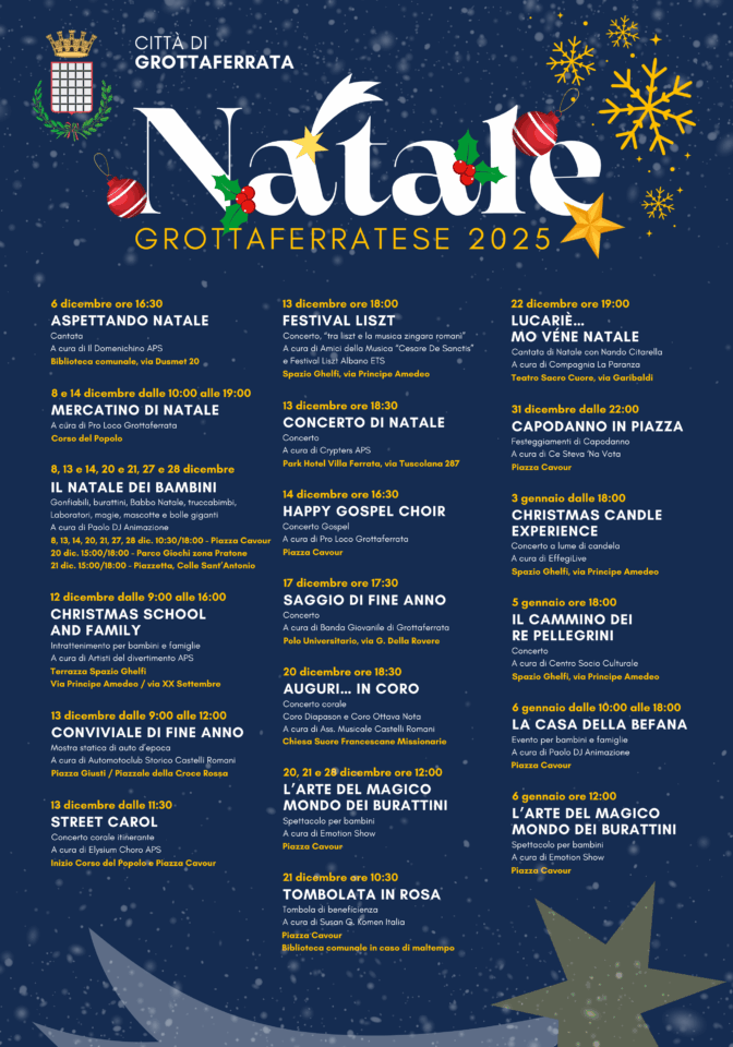 Il programma completo del Natale Grottaferratese è disponibile sul sito istituzionale del Comune di Grottaferrata.