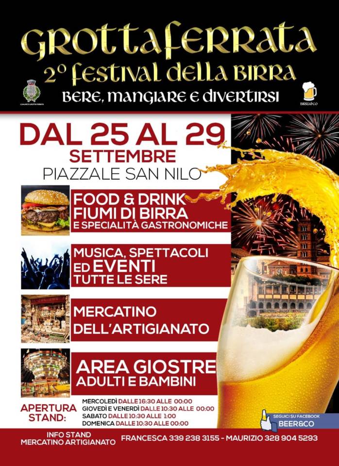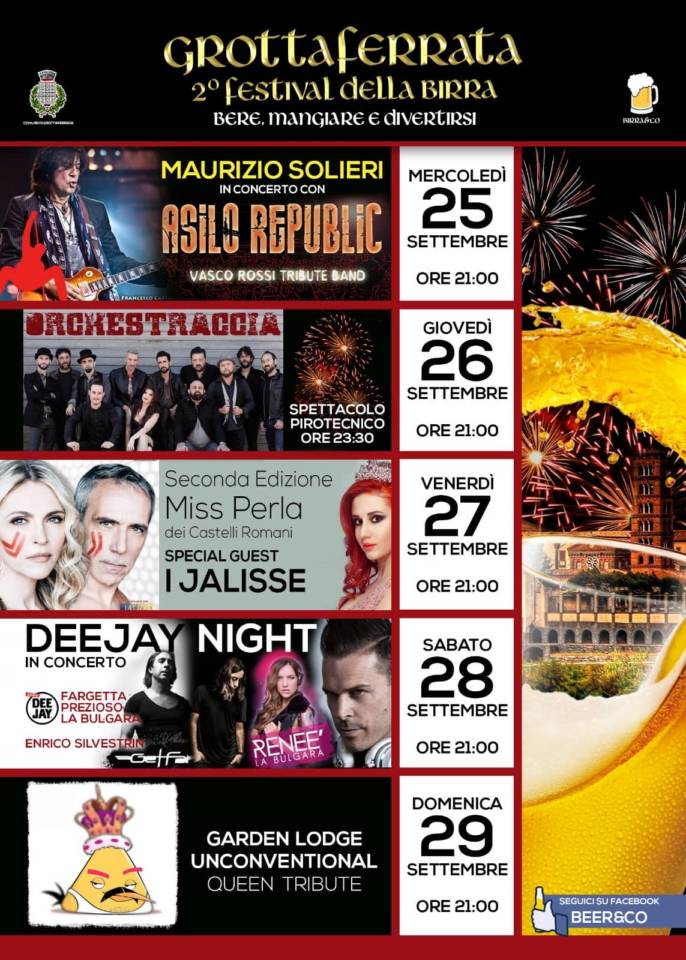 Da Mercoledì 25 a Domenica 29 Settembre torna a Grottaferrata la Festa della Birra. Una cinque giorni di musica, spettacolo e divertimento per le strade del centro storico criptense, a cura dell’Associazione Beer&Co.