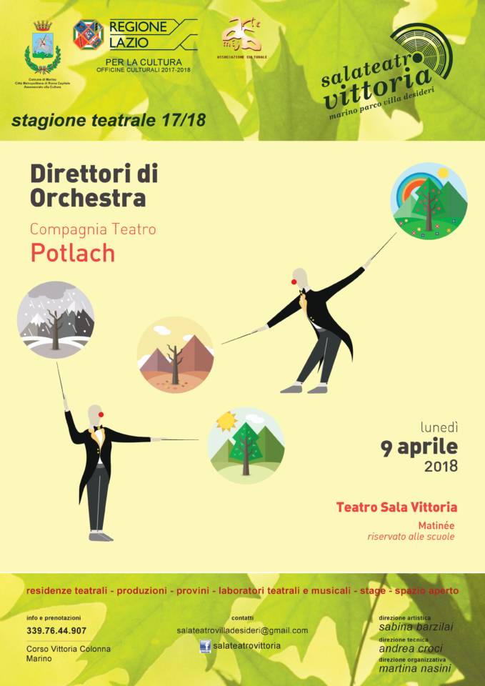 Torna a Marino la Compagnia Teatro Potlach, già ospite della Sala Teatro VITTORIA a dicembre con lo spettacolo “Dialoghi con Trilussa”. Lunedì 9 aprile 2018 l Compagnia sarà protagonista di una Matinée riservata agli alunni delle scuole del territorio con lo spettacolo dal titolo “Direttori d’Orchestra” con le musiche di Vivaldi. “Direttori d’Orchestra”: formano una strana coppia questi due musicisti mentre provano “Le quattro stagioni” di Vivaldi. Uniti da un’amicizia tenera ma turbolenta, ne fanno di tutti i colori: litigano, fanno a pugni, si riconciliano, si fanno scherzi a vicenda, ma dividono anche la fame e l’ultimo biscotto. Scene comiche, tragiche e a volte assurde si susseguono con ritmo frenetico, ricordandoci il gioioso mondo degli artisti di varietà. Il Teatro Potlach, fondato nel 1976 da Pino Di Buduo e Daniela Regnoli, deriva il suo nome dal linguaggio degli indigeni dell’America del nord: il rito del dono gratuito, che conferisce prestigio a chi lo elargisce e a chi lo riceve, superando le leggi del profitto. L’identità artistica del Potlach si è espressa nella produzione di spettacoli, in importanti iniziative pedagogiche, nel continuo scambio con gruppi nazionali e internazionali, alla ricerca di un profilo professionale capace di offrire spettacolo ad ogni tipo di pubblico. “Siamo lieti di poter offrire ai nostri ragazzi un evento come questo – dichiara l’Assessore alla Cultura Paola Tiberi – che avvicina sia alla musica che al teatro. Invitiamo pertanto docenti e studenti a partecipare numerosi alla Matinée loro riservata nell’ambito della stagione teatrale 2017/18 messa a punto dal gestore della Sala, Associazione Artemista presieduta da Sabina Barzilai, Direttore artistico della Sala medesima”.