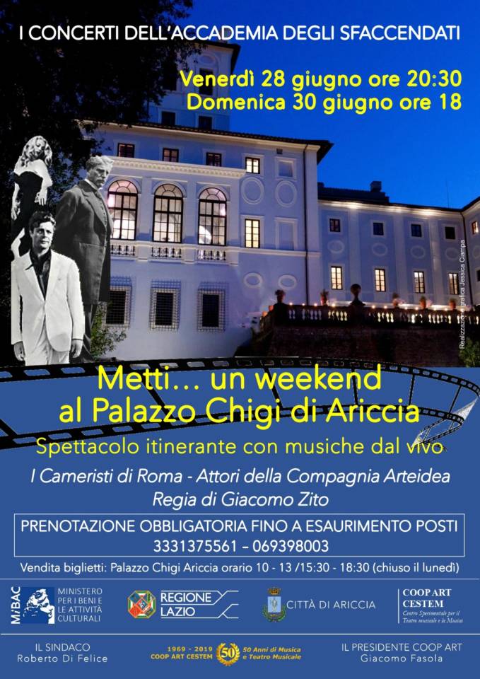 Con alcune novità nei percorsi e nella proiezione di video, venerdì 28 giugno, alle ore 20:30, e domenica 30 giugno, alle ore 18:00, torna lo spettacolo multidisciplinare itinerante Metti…un week end al Palazzo Chigi di Ariccia che tanto successo ha riscosso nelle precedenti edizioni.