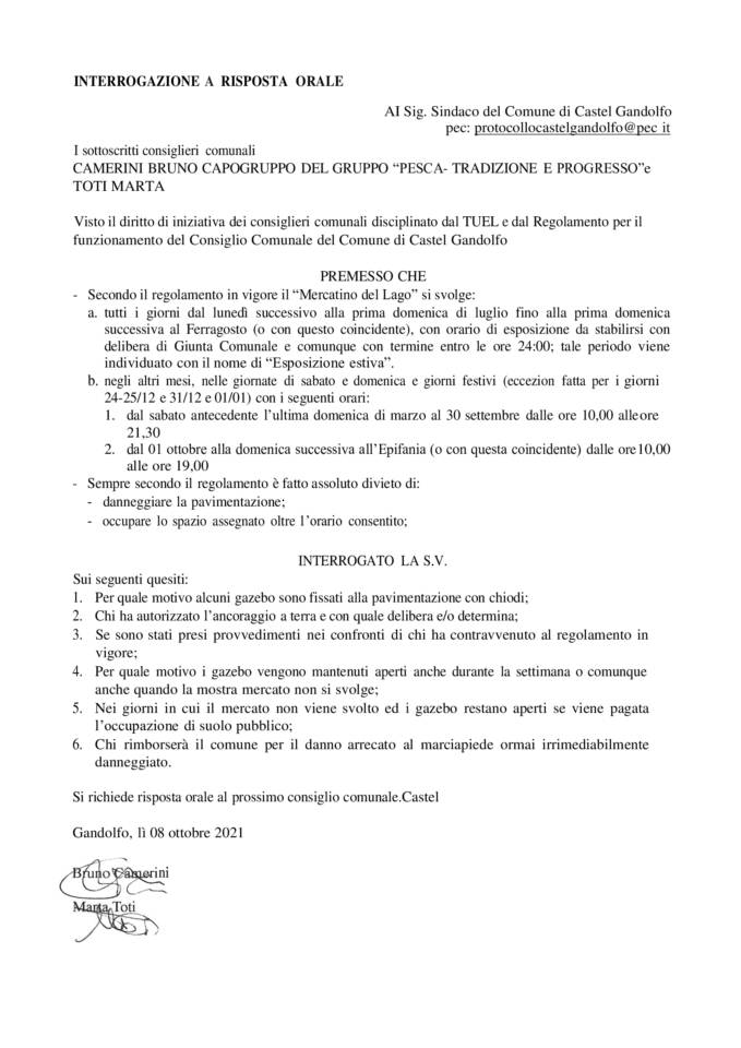 Ieri, 25 ottobre 2021, si è svolto il Consiglio Comunale di Castel Gandolfo ed al primo punto all’Ordine del Giorno c’era l’interrogazione presentata dai Consiglieri Marta Toti e Bruno Camerini, rappresentanti del Gruppo “Pesca – Tradizione e Progresso”, riguardante la situazione dei gazebo del Mercatino del Lago.