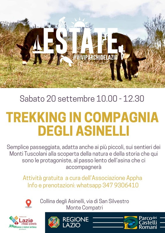 Sabato 20 settembre dalle ore 10.00 alle 12.30, l’appuntamento è presso La Collina degli Asinelli – via di San Silvestro, Monte Compatri (RM), per un trekking gratuito a cura dell’Associazione Appha, adatto anche ai più piccoli, sui sentieri dei Monti Tuscolani.
