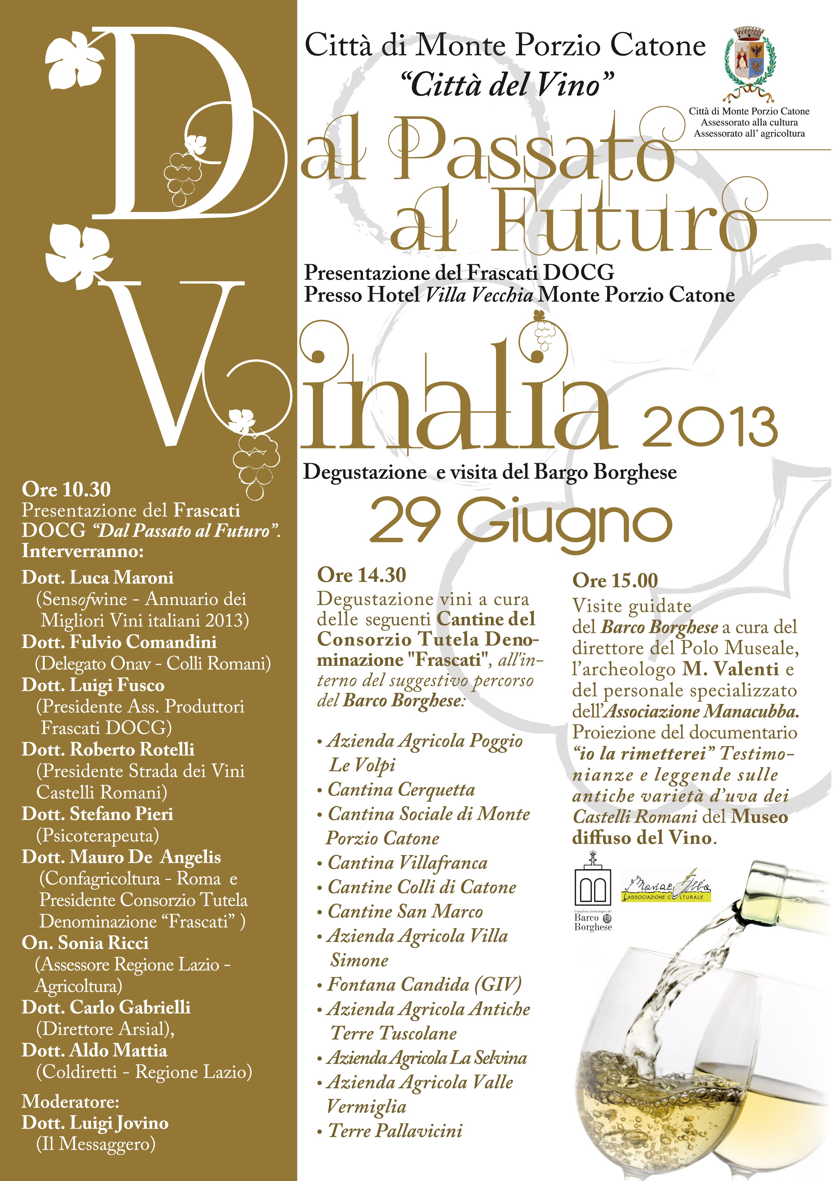 La mattina, con Dal Passato al Futuro, tutti gli esperti del settore si confronteranno in un meeting a Villa Vecchia, tra gli ospiti: Luca Maroni di Sensofwine e curatore dell’Annuario dei migliori vini italiani 2013; Fulvio Comandini, delegato ONAV – Colli Romani; Luigi Fusco, presidente dell’Associazione Produttori Frascati DOCG; Roberto Rotelli, presidente della Strada dei Vini – Castelli Romani; Stefano Pieri, psicoterapeuta; Mauro De Angelis, rappresentante romano di Confagricoltura e neo-confermato presidente del Consorzio Tutela Denominazione “Frascati”; On. Sonia Ricci, Assessore all’Agricoltura della Regione Lazio; Carlo Gabrielli, Direttore Arsial e Aldo Mattia, della Coldiretti – Regione Lazio. Modererà l’incontro Luigi Jovino, giornalista de “Il Messaggero” e farà gli onori di casa il sindaco di Monte Porzio Catone, Luciano Gori, che ricopre anche la carica di Assessore all’Agricoltura e che da sempre si batte per la riaffermazione del vino Frascati sui mercati, «il mercato romano – spiega il Sindaco – è sicuramente la naturale via di commercializzazione del nostro vino, è stato da sempre così e dobbiamo riscoprire questo rapporto in modo privilegiato, per i ristoratori e i consumatori romani significherebbe avere un vino di ottima qualità, a prezzi onesti e a km ø», qualità e sostenibilità quindi al centro del confronto.