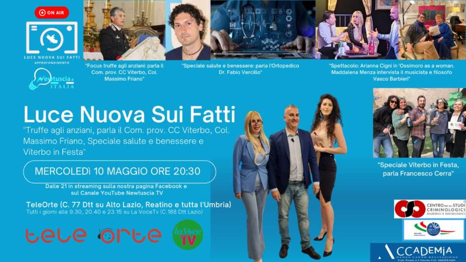 Scatta la 17° puntata della terza edizione di “Luce Nuova sui fatti”, la trasmissione di approfondimento tematico settimanale ideata e condotta dal giornalista viterbese Gaetano Alaimo. Il 10 maggio alle 20.30 su TeleOrte (C. 77 Dtt visibile su tutta l’Umbria, Alto Lazio e provincia di Rieti) con repliche settimanali su Tro e Tro2 e, ogni giorno, su La Voce Tv (C.188 Dtt Lazio) con programmazione alle 9.30, 20.40 e 23.15, ed in streaming sulla pagina di Luce Nuova sui fatti di facebook e sul circuito LSFN sarà in onda il format settimanale più seguito dell’Alto Lazio e tra i più seguiti del Centro Italia.