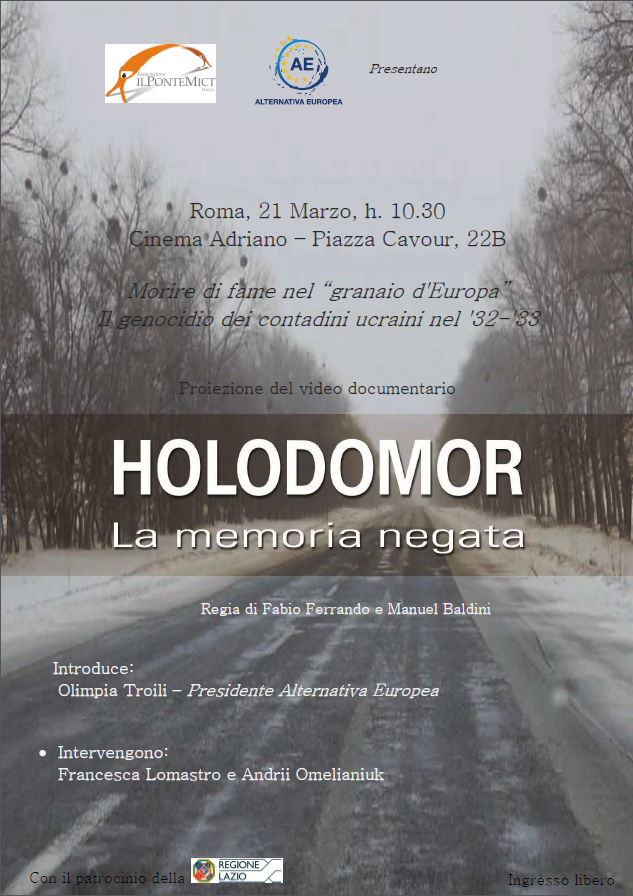 Sabato 21 Marzo alle ore 10:30 presso il Cinema Adriano di Roma in Piazza Cavour, 22b, Alternativa Europea, associazione impegnata nella promozione dei valori europei e convintamente federalista, organizza la proiezione del video documentario ‘Holodomor – La memoria negata’, con il patrocinio della Regione Lazio. A margine della proiezione interverranno Olimpia Troili, Presidente di Alternativa Europea, Francesca Lomastro, ricercatrice dell’Istituto per le ricerche di storia sociale e religiosa di Vicenza e Andrii Omelianiuk, Vicepresidente dell’Associazione Korda di Kiev. Holodomor è il nome della carestia che nei primi anni ’30 del secolo scorso ha provocato la morte per fame di milioni di contadini ucraini. Carestia non dovuta a fenomeni naturali ma indotta dal regime comunista sovietico come ritorsione nei confronti dell’Ucraina, ‘il granaio d’Europa’, per il rifiuto di adeguarsi alle politiche di collettivizzazione imposte dal nascente regime stalinista. La strage, che fu negata fino agli anni ’80 dalla storiografia ufficiale dell’U.R.S.S., intende essere riportata alla luce ed all’attenzione del pubblico internazionale da parte degli autori con questo documentario, ricco di testimonianze dirette e fondato su valide fonti storiche. “Far emergere vicende di una tale portata come quella dell’Holodomor, per troppo dimenticate, – dichiara Olimpia Troili Presidente di Alternativa Europea – è un dovere di chi come noi crede nella possibilità di imparare dalla Storia. La genesi del conflitto odierno tra Russia e Ucraina porta certamente, tra i fattori determinanti, il segno di pagine come questa. L’Unione Europea non può non avviare, anche tenendo conto di quanto verrà presentato nel documentario, una seria riflessione sui propri rapporti di medio e lungo periodo con Ucraina e Russia, anche in virtù del conflitto odierno che non cessa di interrogarci” conclude Troili.