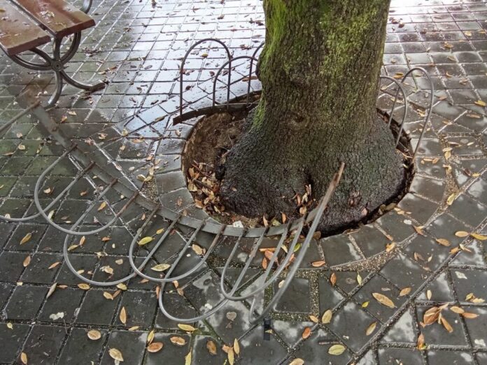 Le protezioni degli alberi sono piegate o divelte, lasciate in uno stato pietoso.